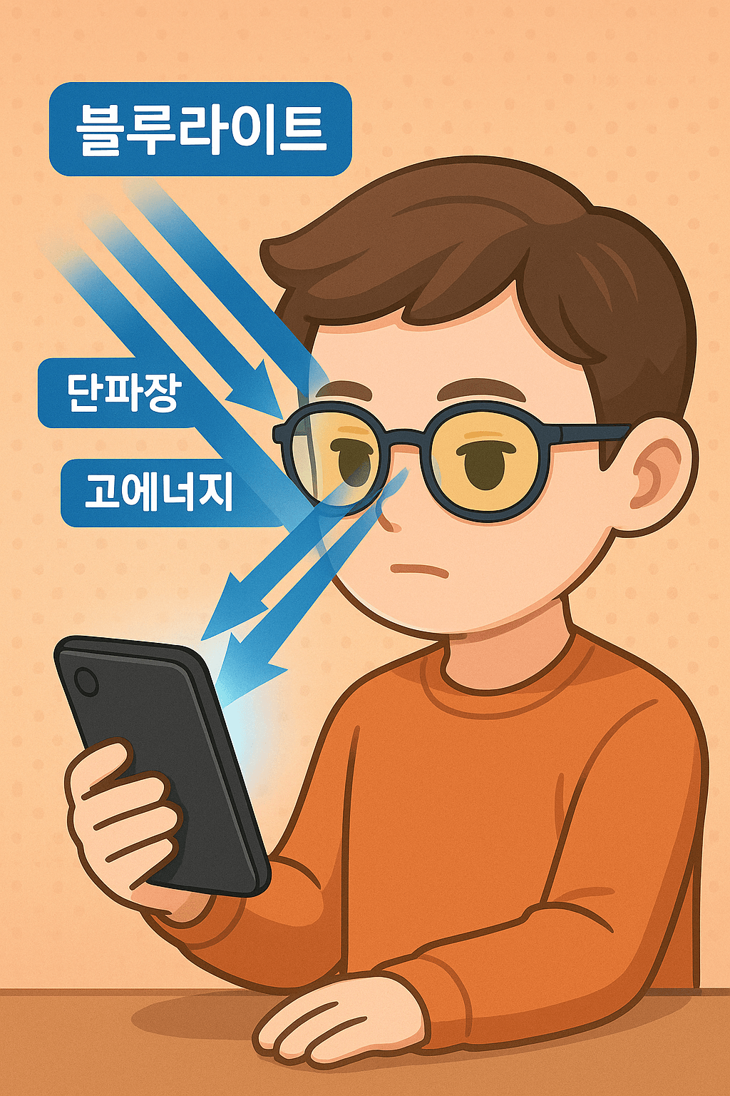 블루라이트는 망막세포에 스트레스를 줘 장기 노출 시 시력 저하 위험이 있습니다.