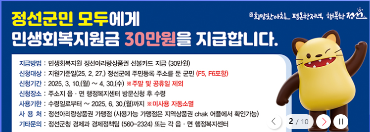 ✔️ 지급방법 : '정선아리랑상품권'으로 30만원 선불카드 형태로 지급