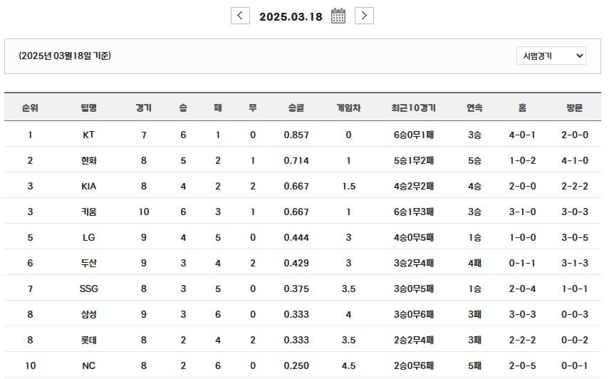 2025년 프로야구 시범경기 결과가 많은 놀라움을 선사했습니다. KT가 압도적인 성적으로 선두를 달리고 있으며, 한화와 KIA가 그 뒤를 이어 강력한 모습을 보여주고 있습니다. 특히 한화는 지난 시즌 대비 큰 향상을 보이며 상위권 도약을 예고했습니다.